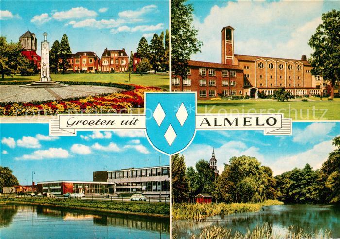 old postcard Almelo Teilansichten Denkmal Kirche Partie am Wasser postalisch gelaufen Erhaltung siehe scans [FriedD77]