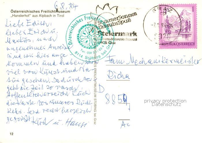 73062762 alte Postkarte Alpbach Hanslerhof Freilichtmuseum postalisch gelaufen Erhaltung siehe scans [KathaD81] KatCode: 11390335070501