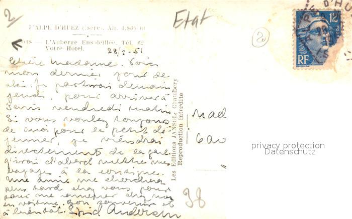 13502065 carte postale Alpe d Huez Isere Auberge Ensoleillee postalisch gelaufen Erhaltung siehe scans [LiesaD40] KatCode: 11170038138191