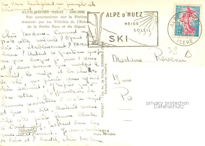 13538855 carte postale Alpe d Huez Isere Vue panoramique sur la Station dominee par les Teleskis de l’Ecole postalisch gelaufen Erhaltung siehe scans [WerneD78] KatCode: 11170038138191