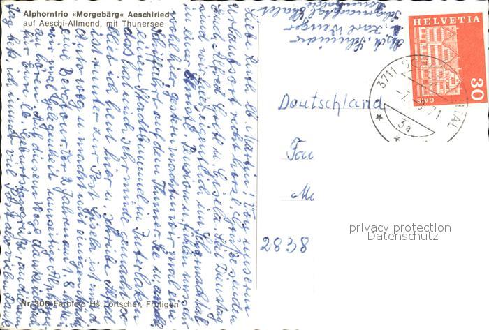 alte Postkarte Alphorn Alphorntrio Morgebaerg Aeschiried Thunersee Kuehe postalisch gelaufen Erhaltung siehe scans