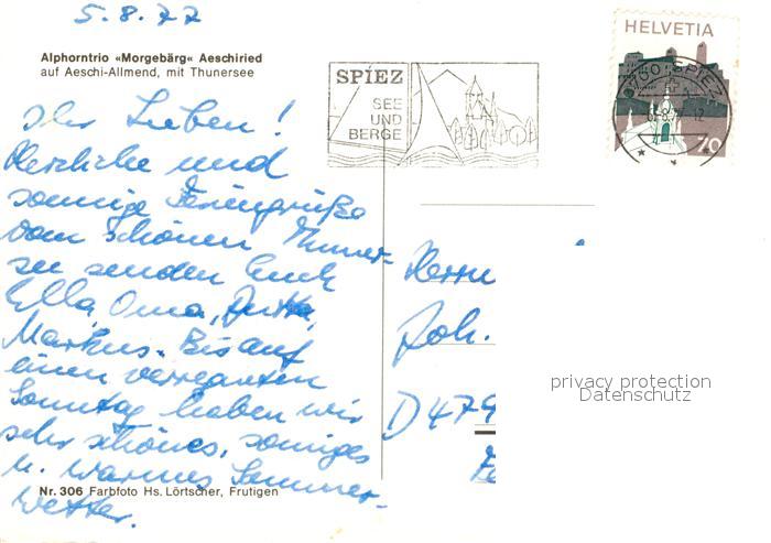 73485286 Alphorn Alphorntrio Morgeb?rg Aeschiried Thunersee K?he postalisch gelaufen Erhaltung siehe scans [PaolaD17] alte Postkarte Paol Katcode 22560000002800