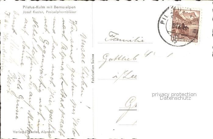 alte Postkarte Alphorn Preialphornblaeser Josef Kuster Kuehe Pilatus-Kulm Berneralpen postalisch gelaufen Erhaltung siehe scans