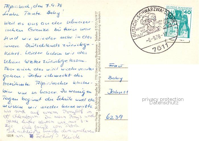 73182426 alte Postkarte Alpirsbach Brunnen Park Kirche Bodenschach Landschaftspanorama Luftkurort Wintersportplatz im Schwarzwald postalisch gelaufen Erhaltung siehe scans [FriedD77] KatCode: 11110008237002