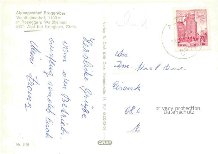 74155986 alte Postkarte Alpl Krieglach Steiermark AT Alpengasthof Bruggraber Waldheimathof postalisch gelaufen Erhaltung siehe scans [WerneD78] KatCode: 11390223061306