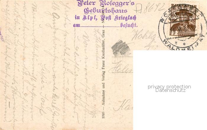 43000208 alte Postkarte Alpl Waldheimat Peter Roseggers Geburtshaus postalisch gelaufen Erhaltung siehe scans [FriedD77] KatCode: 11390223061306