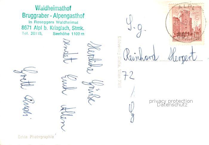 73631225 alte Postkarte Alpl Waldheimathof Bruggraber Alpengasthof Roseggers Geburts und Sterbehaus postalisch gelaufen Erhaltung siehe scans [WerneD78] KatCode: 11390223061306