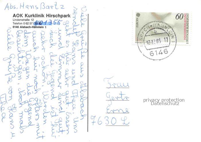 74085095 alte Postkarte Alsbach Bergstrasse Alsbach-Haehnlein Hessen AOK Kurklinik Hirschpark Hallenbad Burg Bastelraum postalisch gelaufen Erhaltung siehe scans [WerneD78] KatCode: 11110006432001