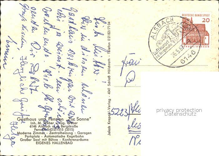 72013272 alte Postkarte Alsbach Bergstrasse Gasthaus Pension Zur Sonne postalisch gelaufen Erhaltung siehe scans KatCode: 11110006432001