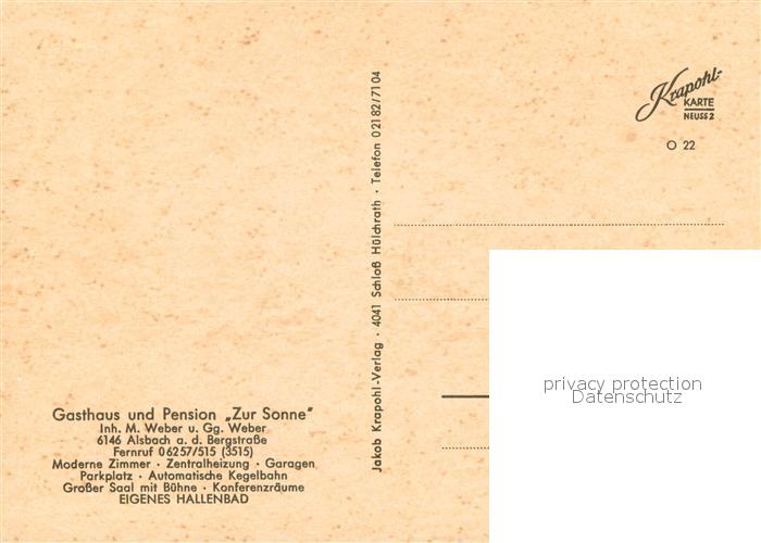 73663761 Alsbach Bergstrasse Gasthaus Pension Zur Sonne postalisch nicht gelaufen Erhaltung siehe scans [LiesaD40] KatCode: 11110006432001