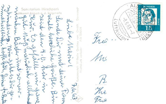 73914701 alte Postkarte Alsbach Bergstrasse Sanatorium Hirschpark postalisch gelaufen Erhaltung siehe scans [FriedD77] KatCode: 11110006432001