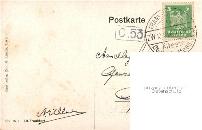 73586257 alte Postkarte Alt Frankfurt Altstadt Roemer Blick zum Dom Kuenstlerkarte postalisch gelaufen Erhaltung siehe scans [FriedD77] KatCode: 11110006412000