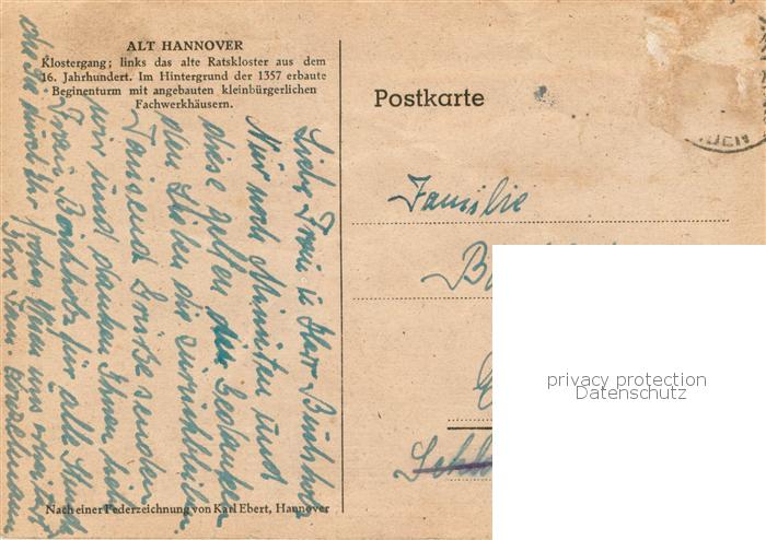 73783911 alte Postkarte Alt Hannover Klostergang Altes Ratskloster Beginenturm Fachwerkhaeuser postalisch gelaufen Erhaltung siehe scans [WerneD78] KatCode: 11110003241001
