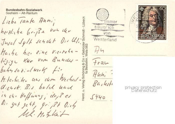 73633873 alte Postkarte Alt Rantum Bundesbahn Sozialwerk Seeheim Alt Rantum Hallenbad postalisch gelaufen Erhaltung siehe scans [WerneD78] KatCode: 11110001054107