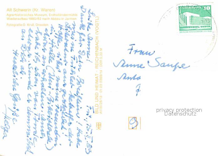 72674108 alte Postkarte Alt Schwerin Agrarhist Museum Erdhollaendermuehle postalisch gelaufen Erhaltung siehe scans [WerneD78] KatCode: 11110013056004