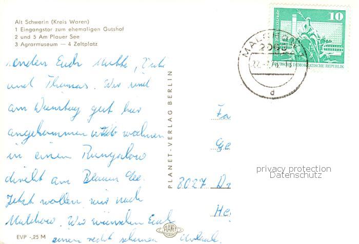 73870885 alte Postkarte Alt Schwerin Eingangstor zum ehem Gutshof Am Plauer See Agrarmuseum Zeltplatz postalisch gelaufen Erhaltung siehe scans [WerneD78] KatCode: 11110013056004