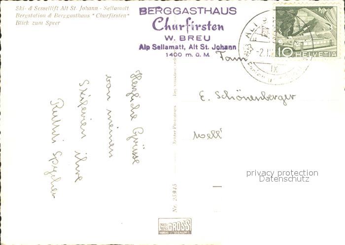 11629651 alte Postkarte Alt St Johann Berggasthaus Churfirsten Sessellift Sellamatt Wintersportplatz Blick zum Speer Appenzeller Alpen postalisch gelaufen KatCode: 11470190585768