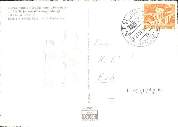 11629489 alte Postkarte Alt St Johann Berggasthof Sellamatt Wintersportplatz Skilift Fliegeraufnahme postalisch gelaufen Erhaltung siehe scans KatCode: 11470190585768