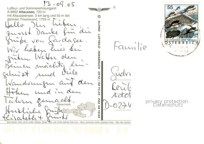 73704937 alte Postkarte Altaussee Fliegeraufnahme mit Altausseersee und Trisselwand postalisch gelaufen Erhaltung siehe scans [WerneD78] KatCode: 11390222061204