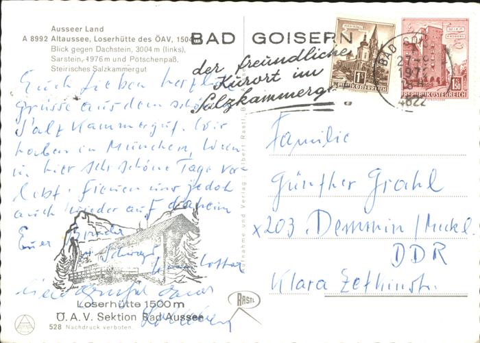 71425408 alte Postkarte Altaussee Loserhuette des oeAV Alpenpanorama Dachstein Sarstein Poetschenpass Steirisches Salzkammergut postalisch gelaufen Erhaltung siehe scans KatCode: 11390222061204
