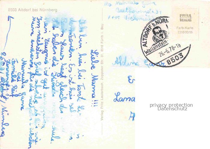 74049062 alte Postkarte Altdorf Nuernberg Stadttor Rathaus Kirche Parkanlagen Rossweiher Historischer Hof Marktplatz Brunnen postalisch gelaufen Erhaltung siehe scans [FriedD77] KatCode: 11110009574112