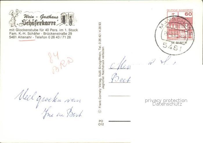 72542232 alte Postkarte Altenahr Wein Gasthaus Schaeferkarre postalisch gelaufen Erhaltung siehe scans [KathaD75 kv015box] KatCode: 11110007131003