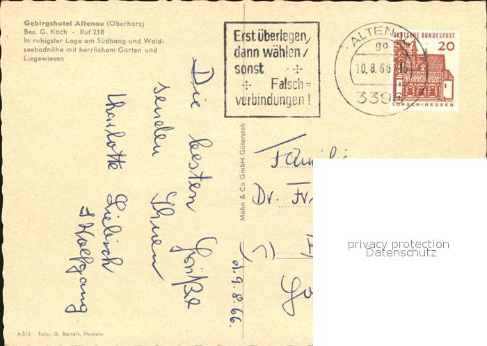 72530123 alte Postkarte Altenau Harz Gebirgshotel postalisch gelaufen Erhaltung siehe scans KatCode: 11110003153001
