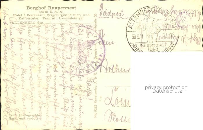 72278019 alte Postkarte Altenberg Dippoldiswalde Berghof Raupennest Hotel Restaurant postalisch gelaufen Feldpost Erhaltung siehe scans KatCode: 11110014290010