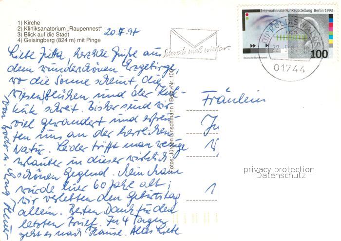 73255144 alte Postkarte Altenberg Erzgebirge Kirche Kliniksanatorium Raupennest Stadtblick Geisingberg mit Pinge postalisch gelaufen Erhaltung siehe scans [WerneD78] KatCode: 11110014290140