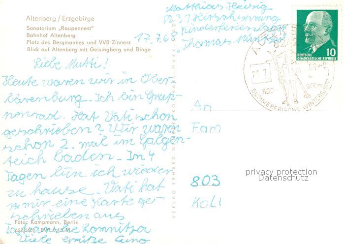 72946538 alte Postkarte Altenberg Erzgebirge Sanatorium Raupennest Bahnhof Platz des Bergmannes postalisch gelaufen Erhaltung siehe scans [LiesaD40] KatCode: 11110014290140