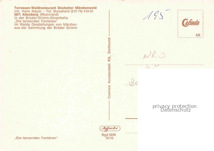 74037655 Altenberg Rheinland Odenthal NRW Terrassen-Waldrestaurant Wasserspiele Deutscher Maerchenwald postalisch nicht gelaufen Erhaltung siehe scans [FriedD77] KatCode: 11110005378020