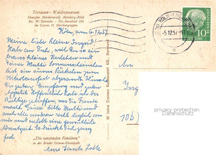 72962582 alte Postkarte Altenberg Rheinland Terrassen-Waldrestaurant Die tanzenden Fontaenen Brueder Grimm Ehrenhalle postalisch gelaufen Erhaltung siehe scans [NatalD47] KatCode: 11110005378020