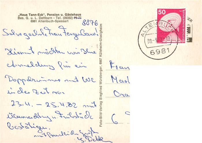 73897518 alte Postkarte Altenbuch Unterfranken Haus Tann Eck Pension und Gaestehaus Gastraeume Panorama postalisch gelaufen Erhaltung siehe scans [WerneD78] KatCode: 11110009676111