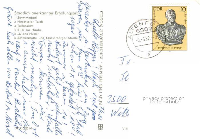 72686444 alte Postkarte Altenfeld Thueringen Schwimmbad Hirschtaler Teich Blick zur Haube Diana H?tte Schmelzh?tte und Masserberger Strasse postalisch gelaufen Erhaltung siehe scans [FriedD77] KatCode: 11110016070002