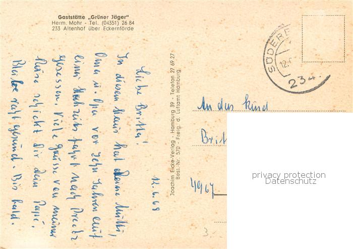 73761903 alte Postkarte Altenhof Eckernfoerde Gaststaette Gruener Jaeger Fliegeraufnahme postalisch gelaufen Erhaltung siehe scans [FriedD77] KatCode: 11110001058004
