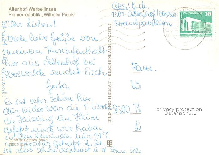 73684965 alte Postkarte Altenhof Werbellinsee Pionierrepublik Wilhelm Pieck postalisch gelaufen Erhaltung siehe scans [FriedD77] KatCode: 11110012060198