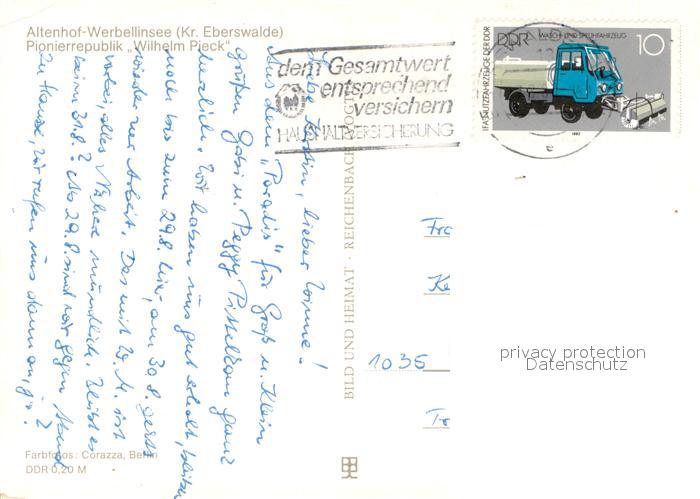 73684955 alte Postkarte Altenhof Werbellinsee Pionierrepublik Wilhelm Pieck postalisch gelaufen Erhaltung siehe scans [FriedD77] KatCode: 11110012060198