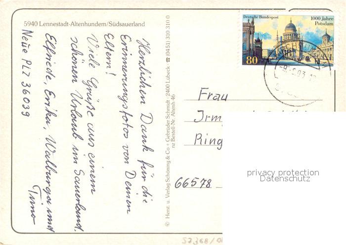 73670489 alte Postkarte Altenhundem Ortsansicht mit Kirche Hohe Bracht Aussichtsturm Fachwerkhaus Gebaeude Innenstadt Brunnen postalisch gelaufen Erhaltung siehe scans [FriedD77] KatCode: 11110005966020
