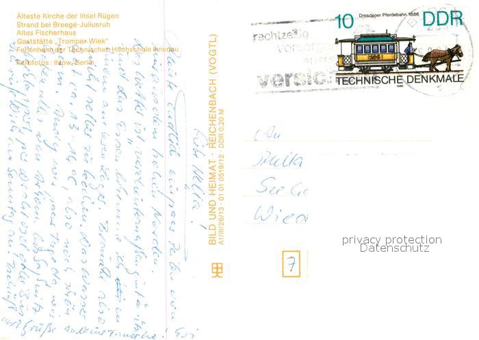 73047920 alte Postkarte Altenkirchen Ruegen Strand Breege Juliusruh Altes Fischerhaus aelteste Kirche Tromper Wiek postalisch gelaufen Erhaltung siehe scans [KathaD81] KatCode: 11110013061002