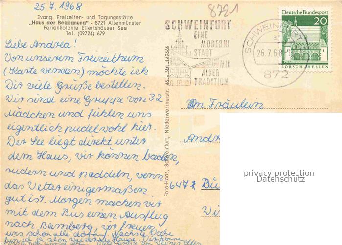 74054450 alte Postkarte Altenmuenster Unterfranken Haus der Begegnung Ev Tagungsstaette postalisch gelaufen Erhaltung siehe scans [WerneD78] KatCode: 11110009678181