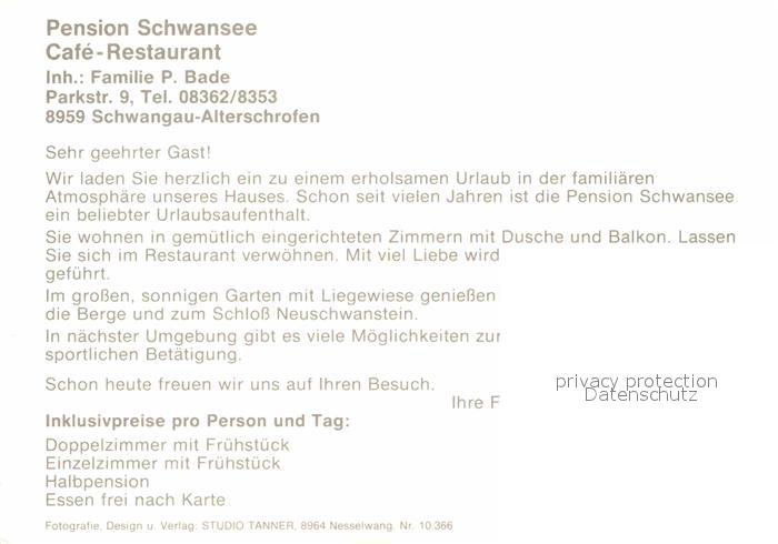 72619357 Alterschrofen Pension Schwansee Cafe Restaurant Schloss Neuschwanstein postalisch nicht gelaufen Werbekarte (keine Postkarte) Erhaltung siehe scans [FriedD77] KatCode: 11110009777169