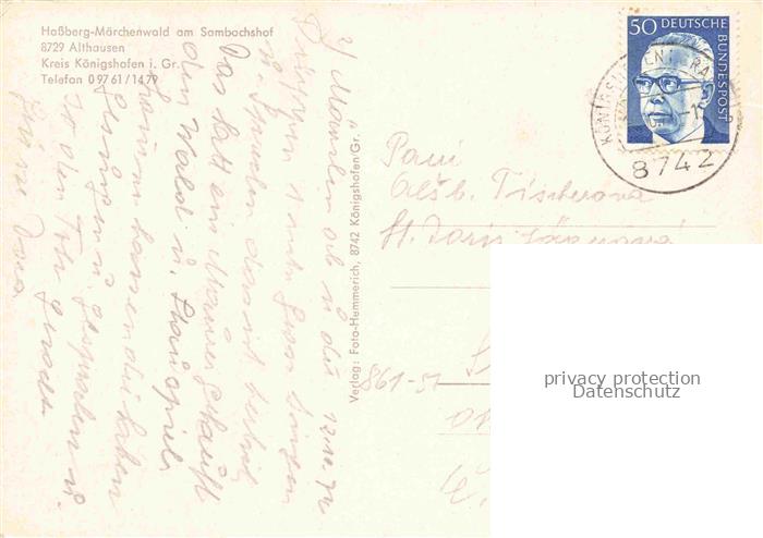 74054949 alte Postkarte Althausen Grabfeld Hassberg Maerchenwald am Sambachshof mit Baehnle postalisch gelaufen Erhaltung siehe scans [WerneD78] KatCode: 11110009673141