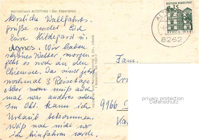72639704 alte Postkarte Altoetting Kapellplatz Gnadenkapelle Kirche Briefschwalbe Wallfahrtsort postalisch gelaufen Erhaltung siehe scans [FriedD77] KatCode: 11110009171111