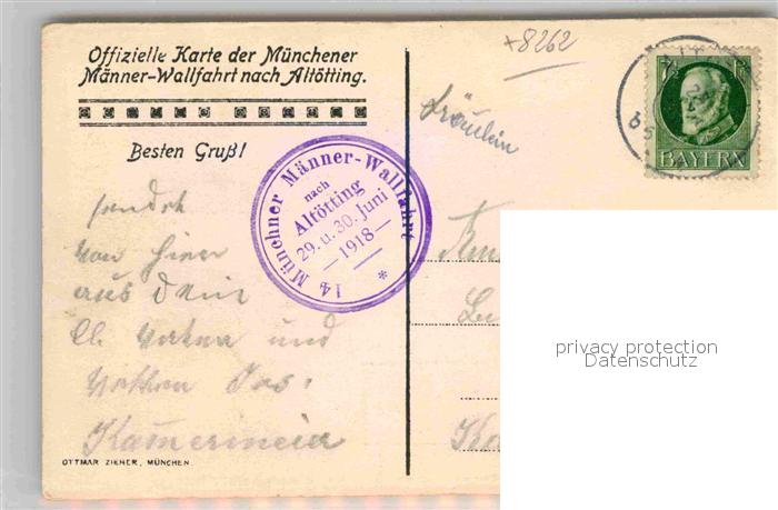 42649765 alte Postkarte Altoetting Muenchener Maenner Wallfahrt Juni 1918 postalisch gelaufen Erhaltung siehe scans [KathaD79] KatCode: 11110009171111