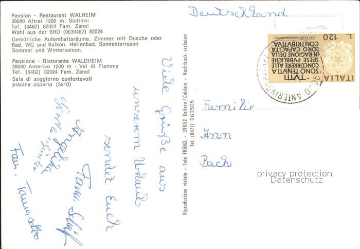 old postcard Altrei Suedtirol Pension Restaurant Waldheim Hallenbad Ortsansicht Kirche Alpen postalisch gelaufen Erhaltung siehe scans