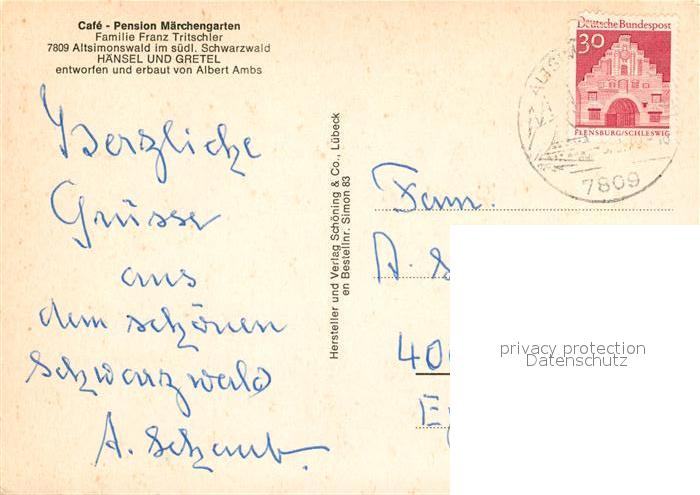 73291704 alte Postkarte Altsimonswald Cafe Pension Maerchengarten Haensel und Gretel postalisch gelaufen Erhaltung siehe scans [KathaD81] KatCode: 11110008316042