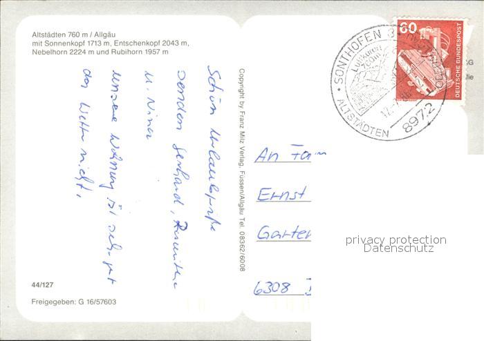 72424165 alte Postkarte Altstaedten Allgaeu Fliegeraufnahme mit Sonnenkopf Entschenkopf Nebelhorn und Rubihorn postalisch gelaufen Erhaltung siehe scans KatCode: 11110009780139