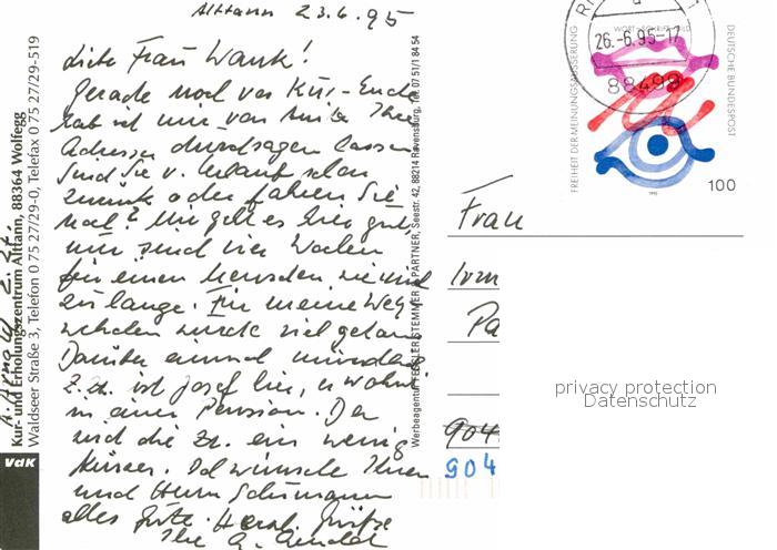 72928936 alte Postkarte Alttann Allgaeu Kur und Erholungszentrum Restaurant Hallenbad postalisch gelaufen Erhaltung siehe scans [FriedD77] KatCode: 11110008436085