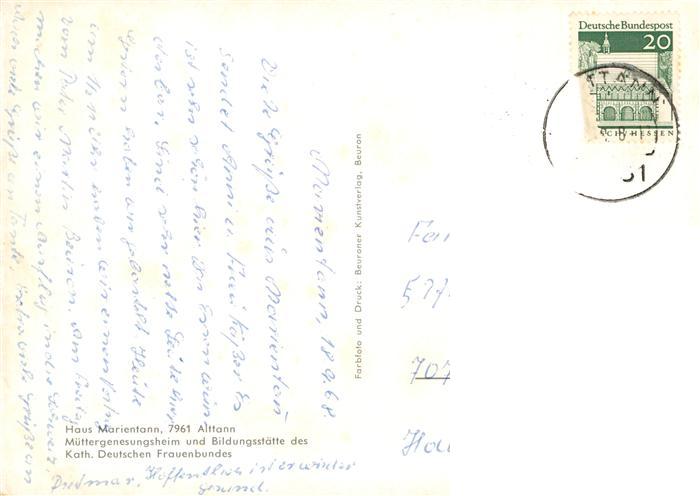 73924932 alte Postkarte Alttann Allgaeu Muettergenesungsheim und Bildungsstaette des Kath. Deutschen Frauenbundes Haus Marientann postalisch gelaufen Erhaltung siehe scans [FriedD77] KatCode: 11110008436085