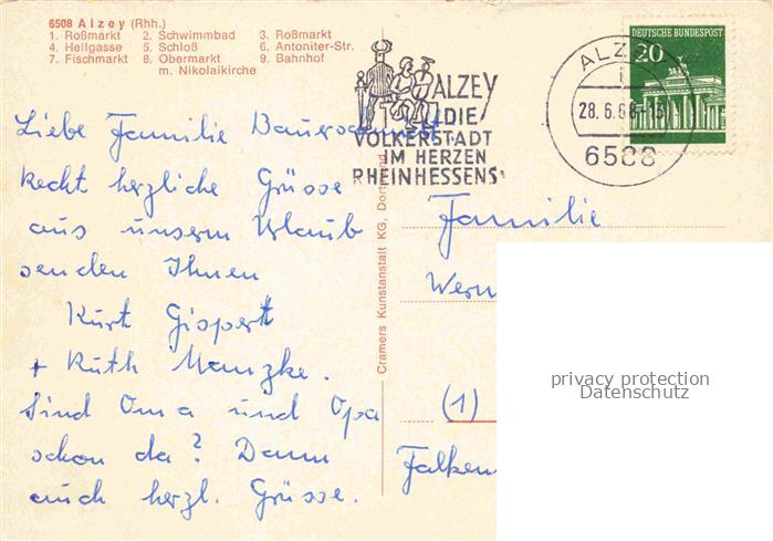74042684 alte Postkarte Alzey Sehenswuerdigkeiten der Stadt Schloss Freibad Zentrum postalisch gelaufen Erhaltung siehe scans [FriedD77] KatCode: 11110007331003